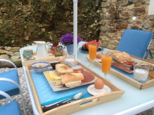 Rond half negen de volgende ochtend werd ons ontbijt geserveerd op onze tuintafel in de tuin. Dat was ook wel nodig zo’n tafel want wat hadden zij een super ontbijt voor ons gemaakt. ZO waanzinnig lekker!